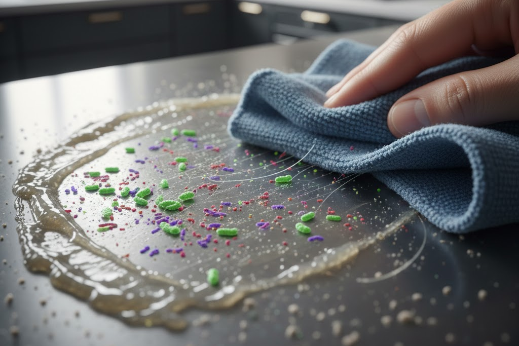 Lapisan polimer ini adalah magnet bagi debu dan media tumbuh sempurna bagi bakteri berbahaya. Riset menunjukkan bahwa menggunakan kain lap biasa justru berisiko menyebarkan kuman ke area lain (cross-contamination), bukan menghilangkannya.